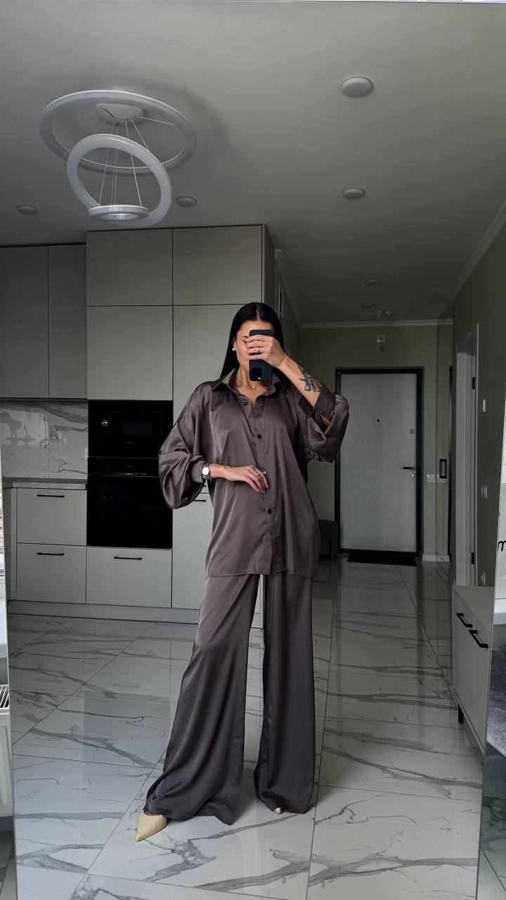 Шелковый костюм тройка (штаны с высокой посадкой, рубашка свободного кроя,платок) темный мокко