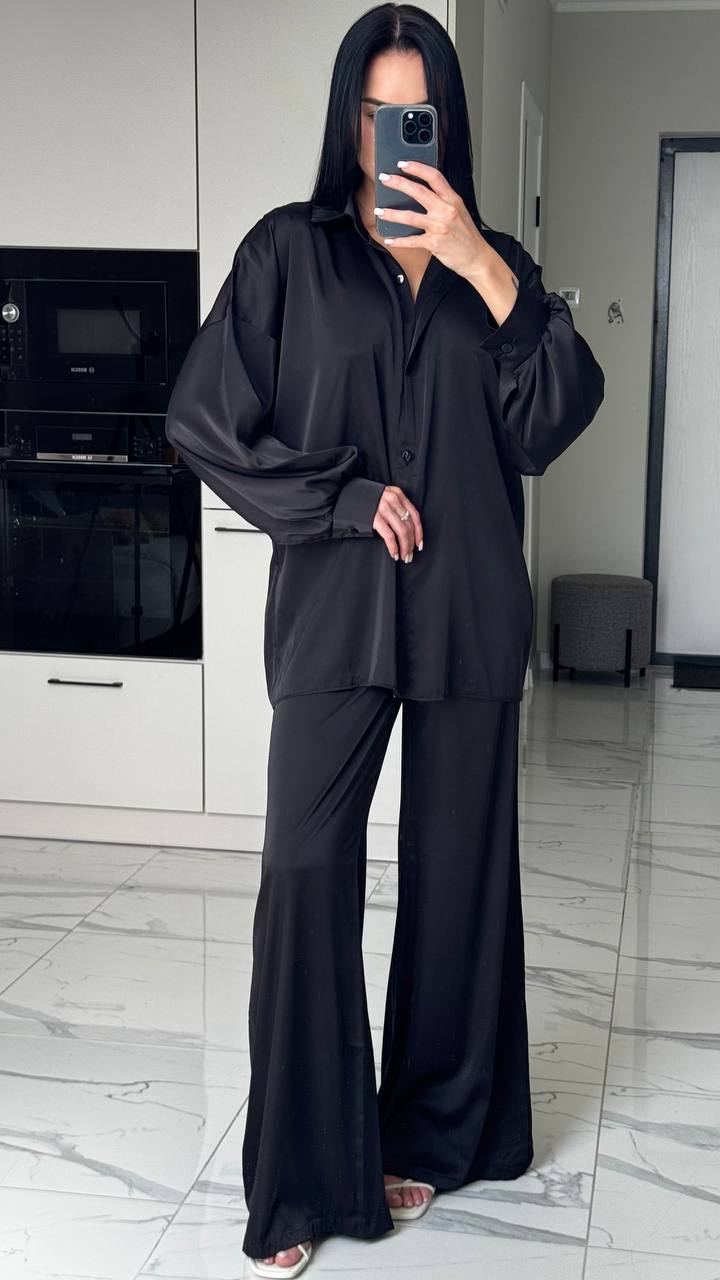 Шелковый костюм тройка (штаны с высокой посадкой, рубашка свободного кроя,платок) черный