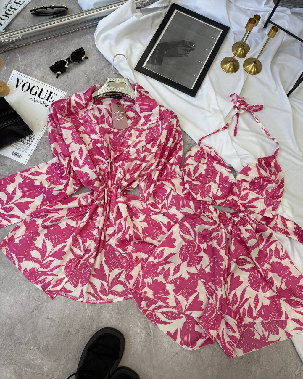 Шелковый костюм тройка: удлиненная рубашка+топ+шорты розовый