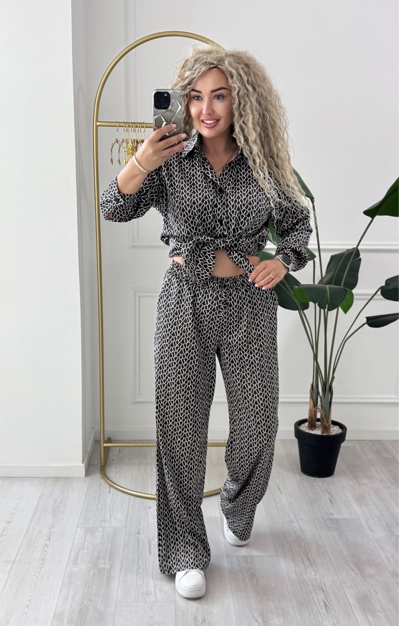 Шелковый костюм в геометрический принт (брюки палаццо+рубашка свободного кроя) черно-белый