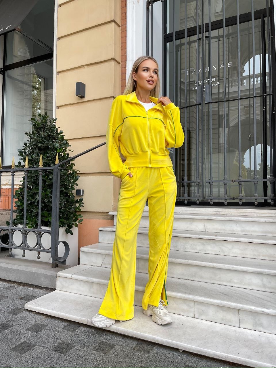 Шикарный велюровый костюм с кантом (кофта на молнии+свободные брюки со стрелками) желтый