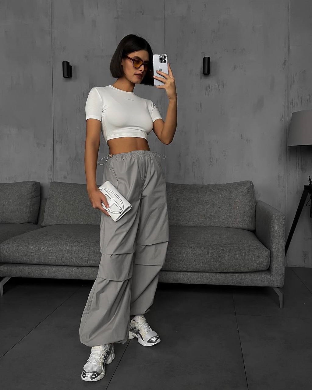 Широченные штаны карго – это признанный хит. Брюки идут с двумя функциональными карманами сзади и двумя карманами на кнопках по бокам.