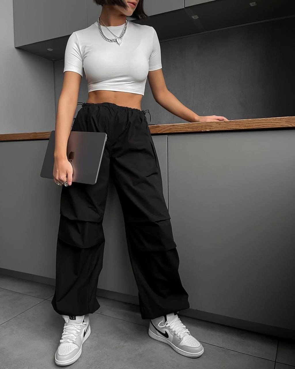 Широченные штаны карго – это признанный хит. Брюки идут с двумя функциональными карманами сзади и двумя карманами на кнопках по бокам.