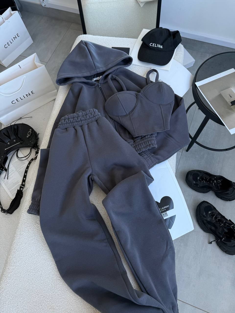 Спортивный костюм тройка (Худи oversize на молнии +топ+свободные брюки) графит