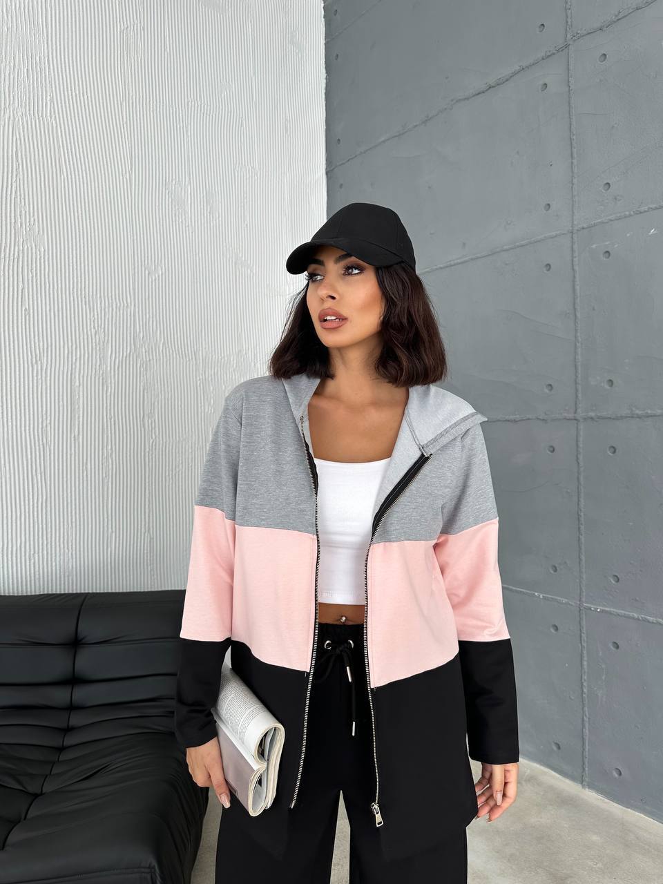 Спортивный костюм (удлиненная кофта+штаны свободные) черный+меланж+розовый