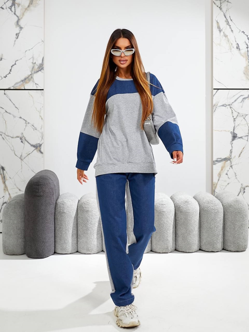 Спортивный костюм в сочетании трикотажа+джинсовой ткани (кофта с круглой горловиной+брюки) серый