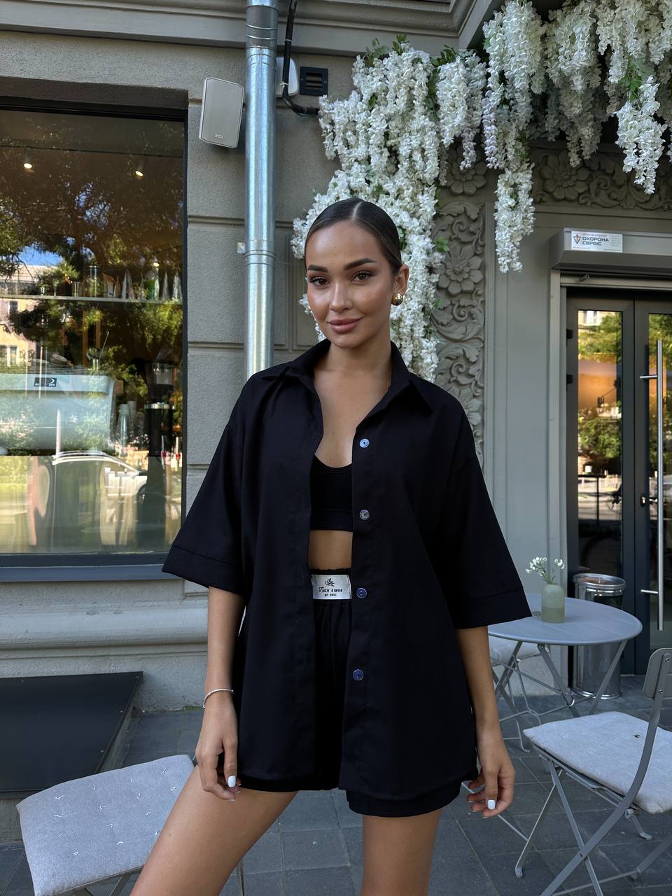 Стильно и кайфово, oversize рубашка и шорты с карманами и эмблемой.