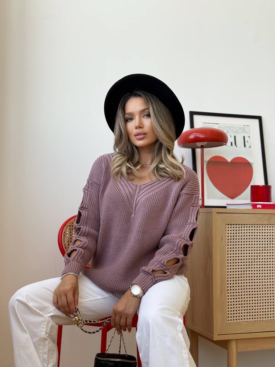 Светрик с прорезями на рукавах и глубоким V-образным вырезом темная пудра