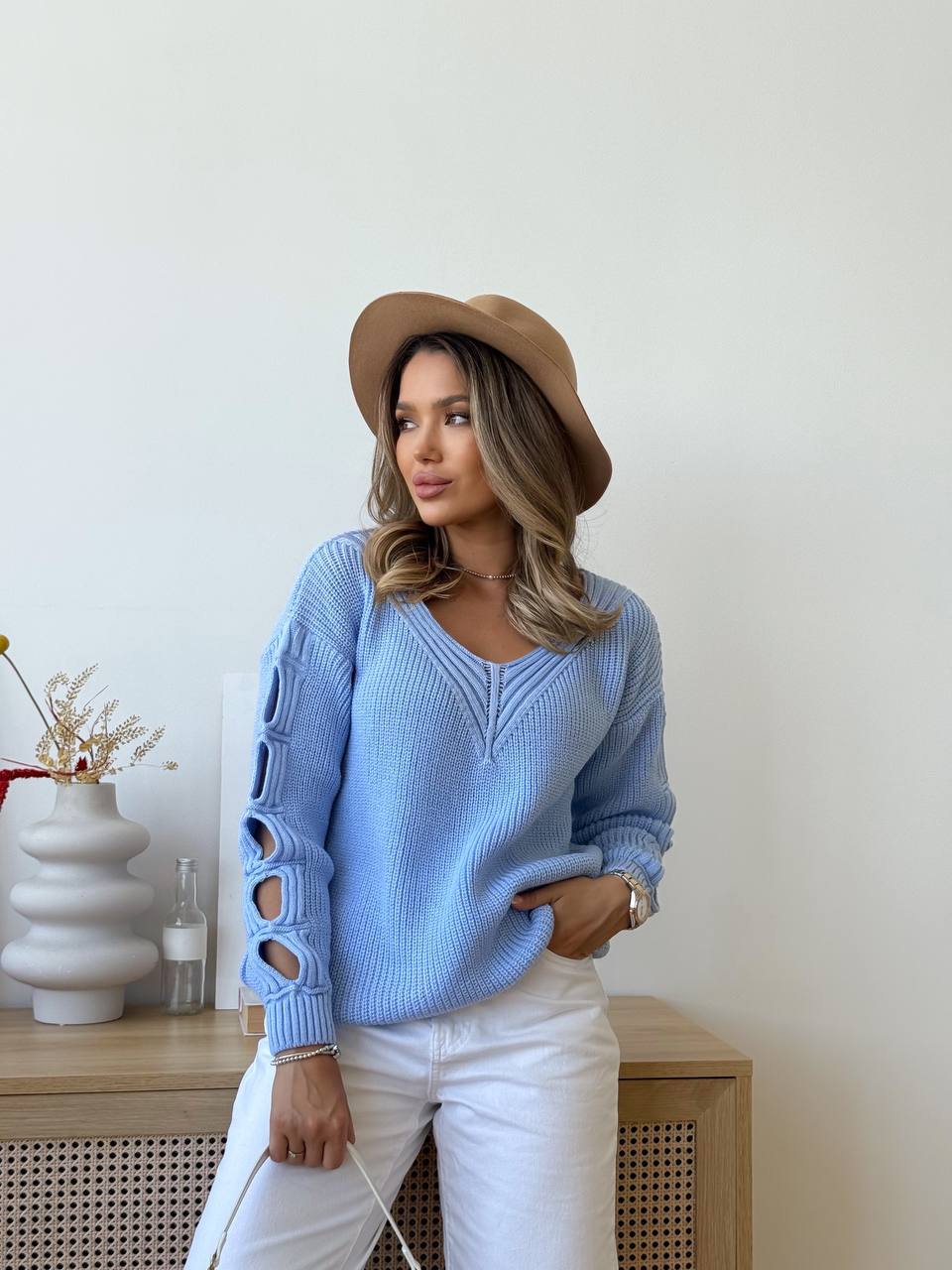Светрик с прорезями на рукавах и глубоким V-образным вырезом голубой