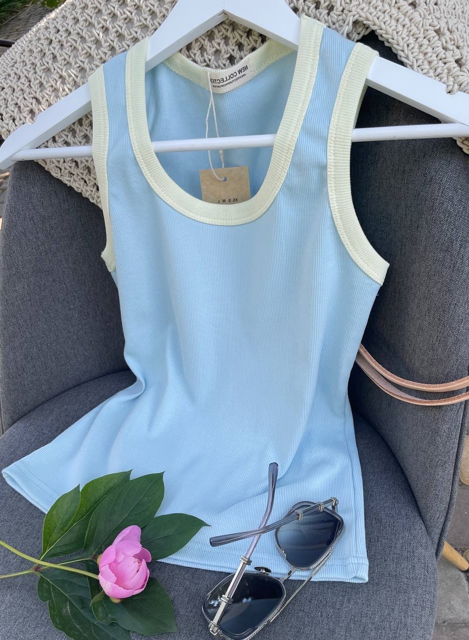 Трикотажная Майка в рубчик, тянется, небесно голубой+контрастная отделка