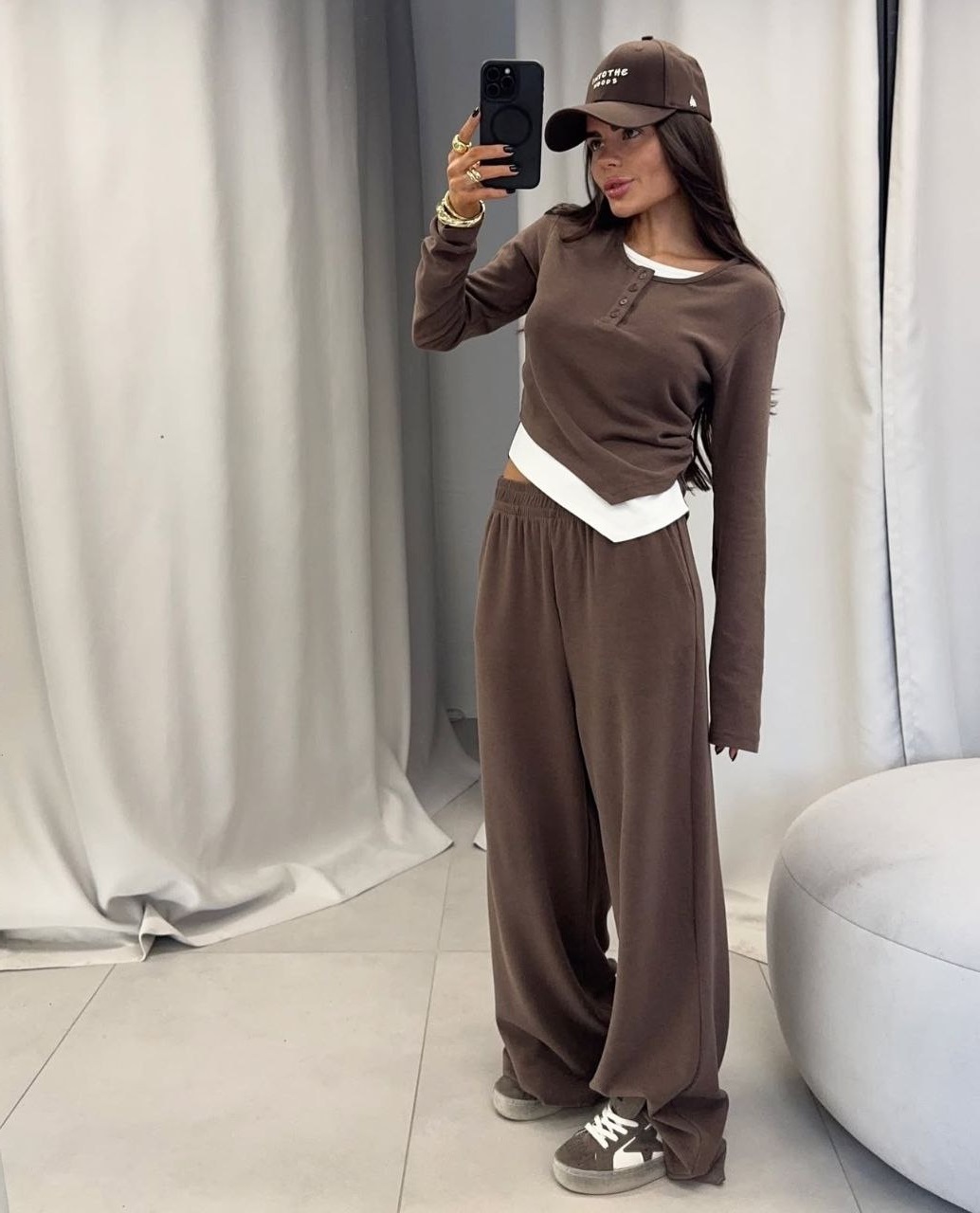 Трикотажний костюм (кофта на пуговицах по горловине с ассметричным низом+свободные брюки) шоколад