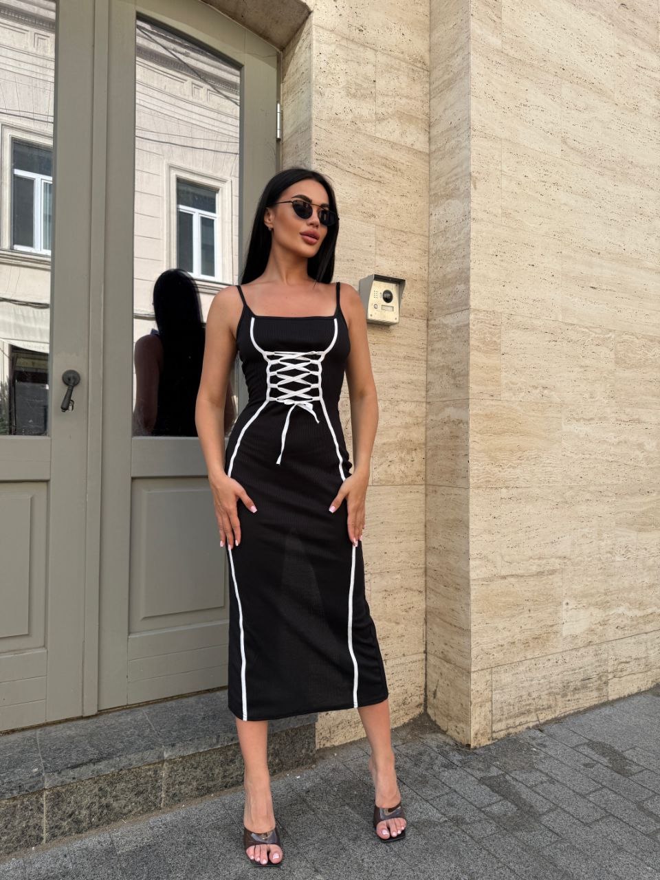 Головна » Магазин » ОДЕЖДА » ПЛАТЬЯ ТУНИКИ САРАФАНЫ » Трикотажное Платье по фигуре со шнуровкой по талии на бретелях черный