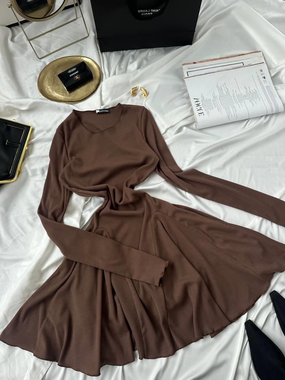 Трикотажное платье с расклешенной юбкой с воланами длиной мини шоколад
