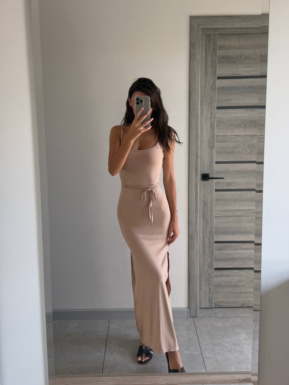 Трикотажное платье с соблазнительными разрезами и длинным поясом бежевый