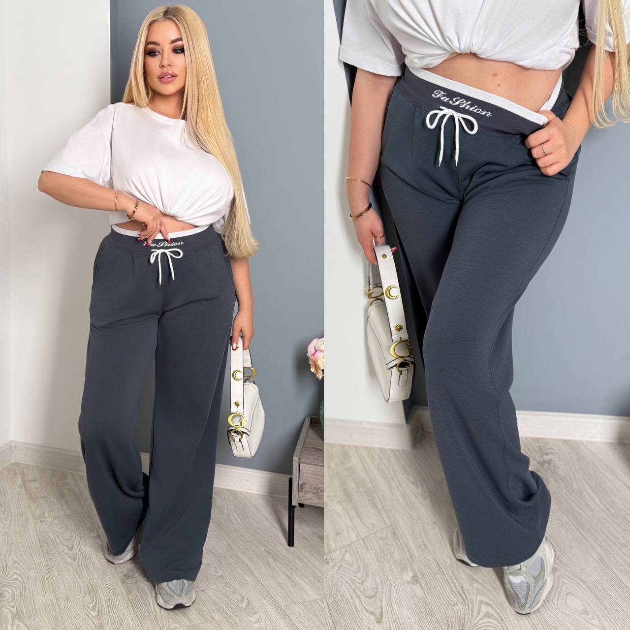 Головна » Магазин » ОДЕЖДА » ЖЕНСКИЕ ШТАНЫ ДЖИНСЫ БРЮКИ ЛОСИНЫ » Трикотажные брюки прямого кроя из двухнитки+поясом на резинке графит