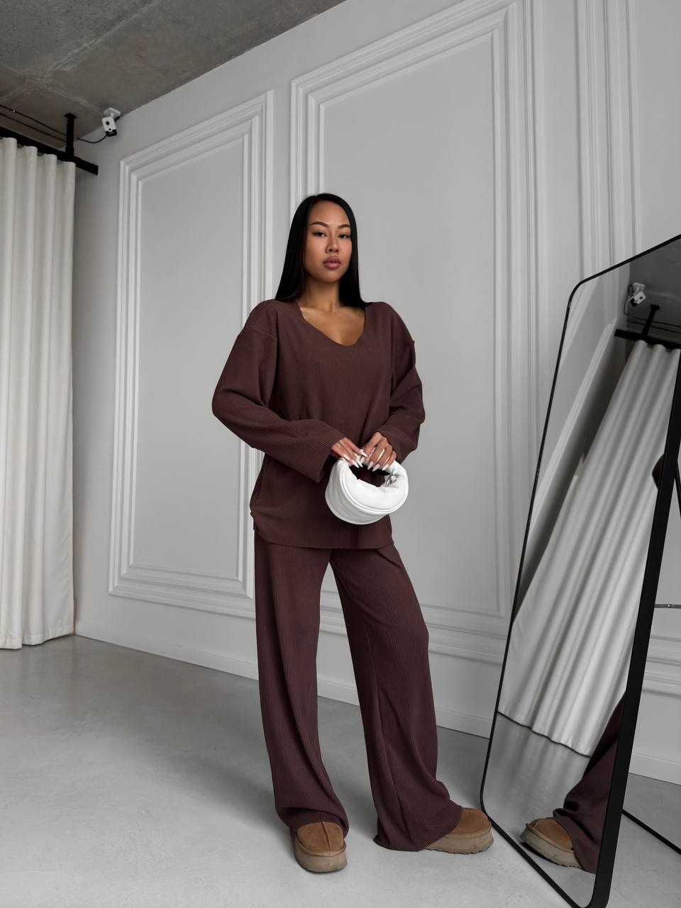 Трикотажный костюм (брюки с высокой посадкой+кофта удлиненная с v-образным вырезом) шоколад