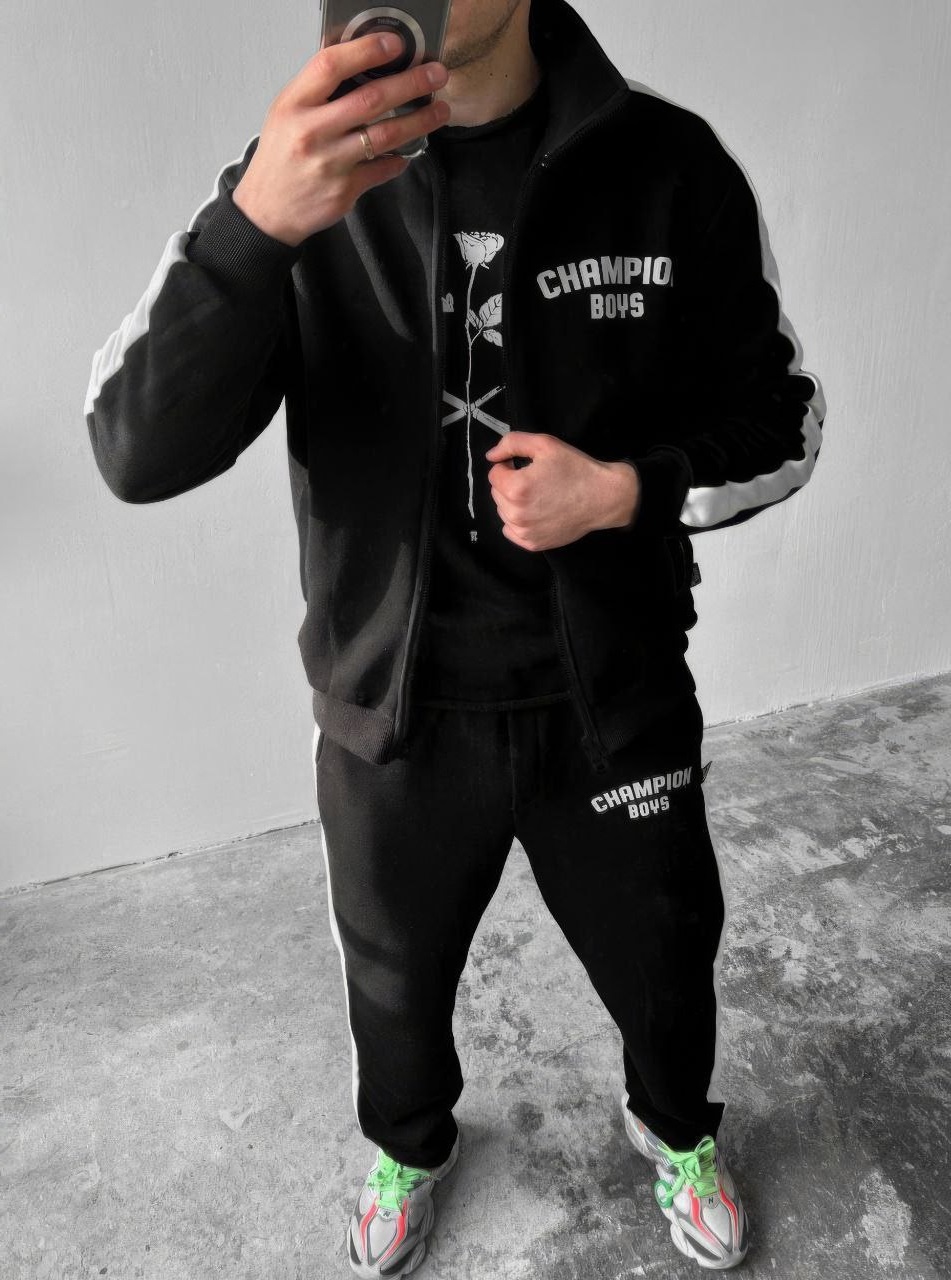 Будьте первым, кто оставил отзыв на “Трикотажный костюм из двухнитки с лампасами (кофта с карманами+брюки прямого кроя) черный”