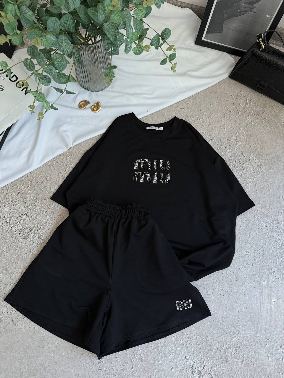 Трикотажный костюм из двухнитки (шорты+футболка свободного кроя) черный