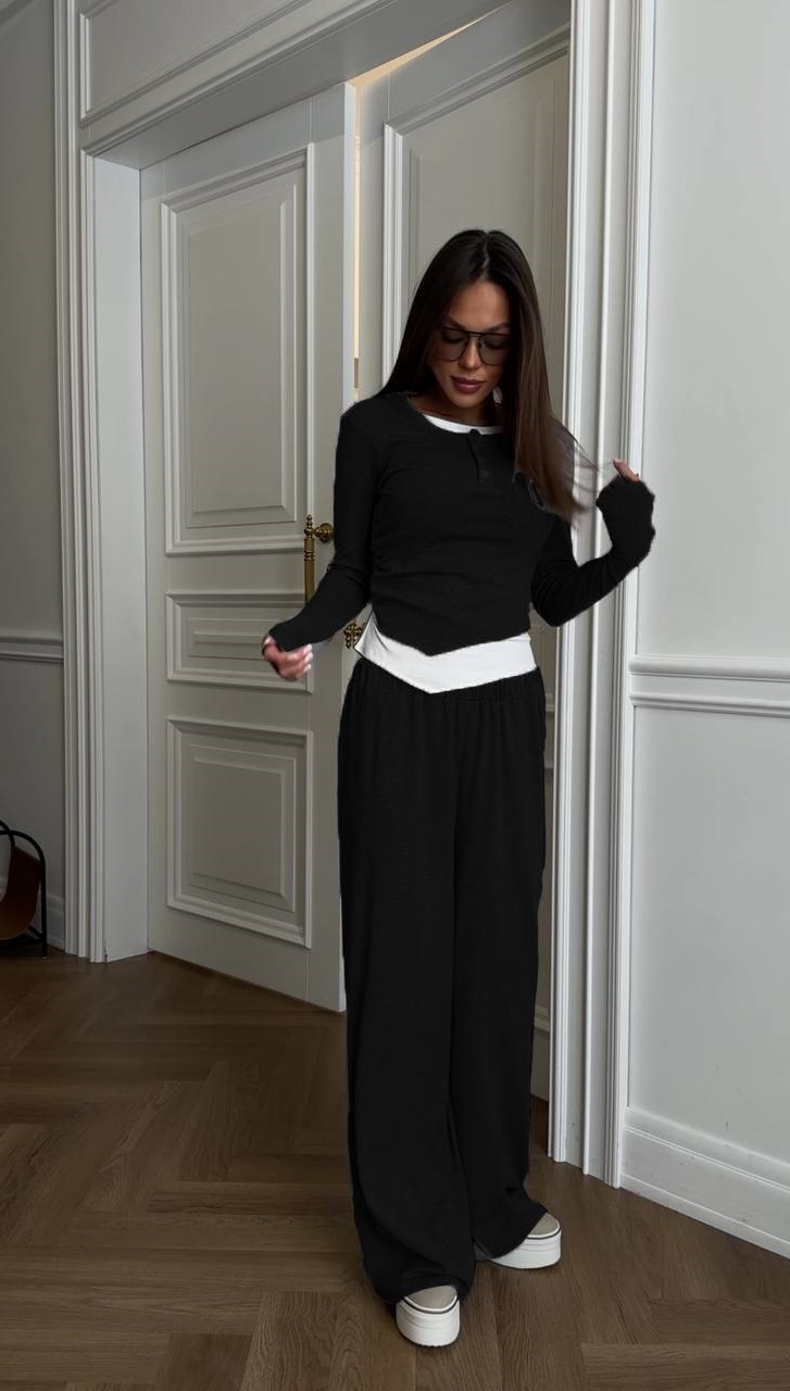Будьте первым, кто оставил отзыв на “Трикотажный костюм из вискозы (кофта с контрастной вставкой+свободные брюки) черный”