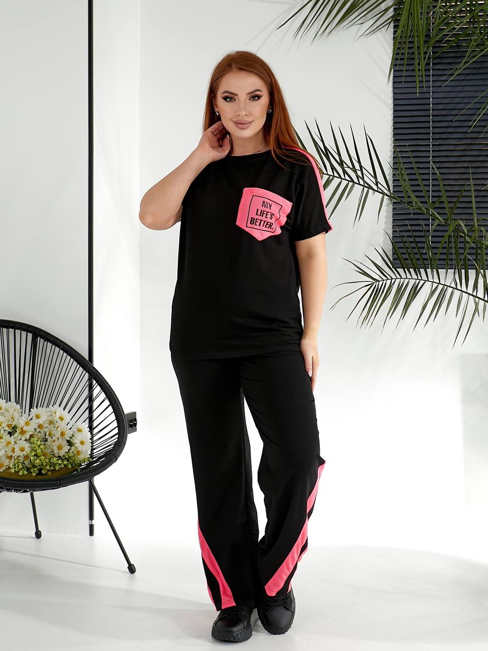 Трикотажный костюм с лампасами (футболка с карманчиком+брюки с карманами) черный+малина