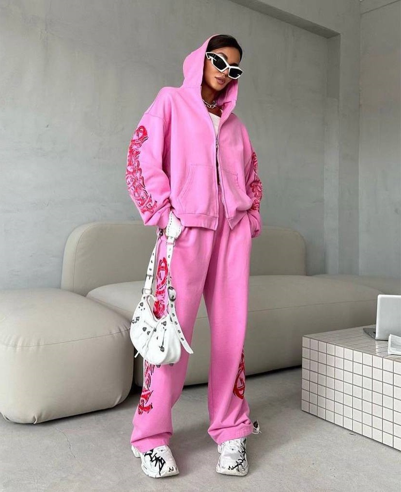 Костюм состоит из цельнокройных широких брюк и кофты на молнии.