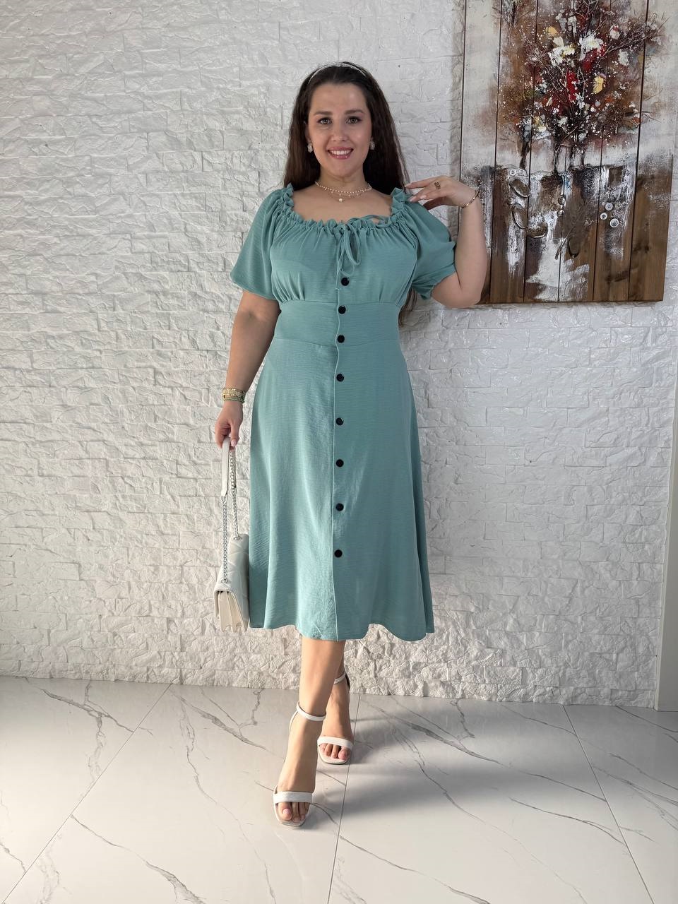 Удлиненное платье на пуговицах свободного кроя со шнуровкой по спинке+по горловине кулиска фисташка