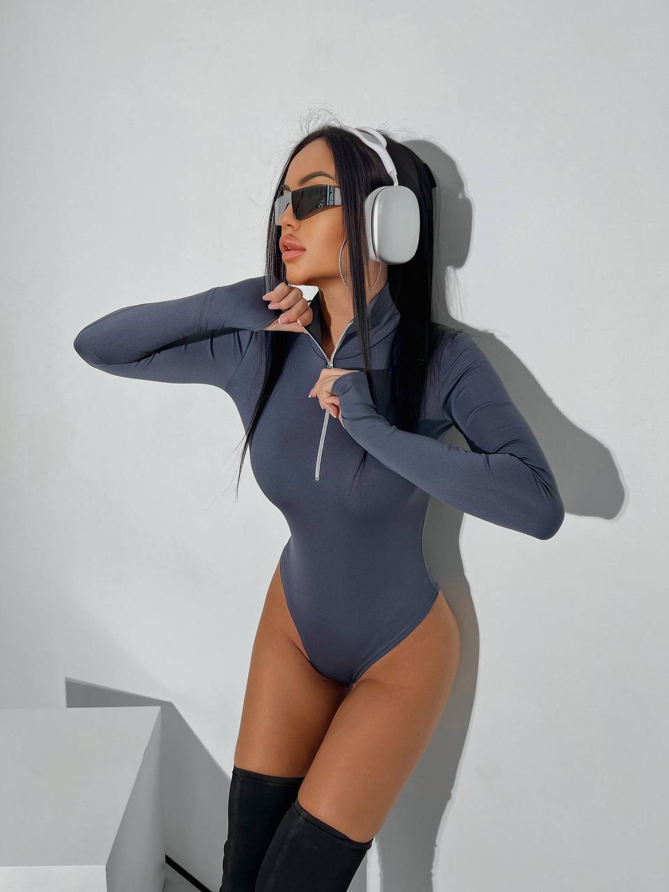 Удобное боди на молнии с разрезом под пальчик графит
