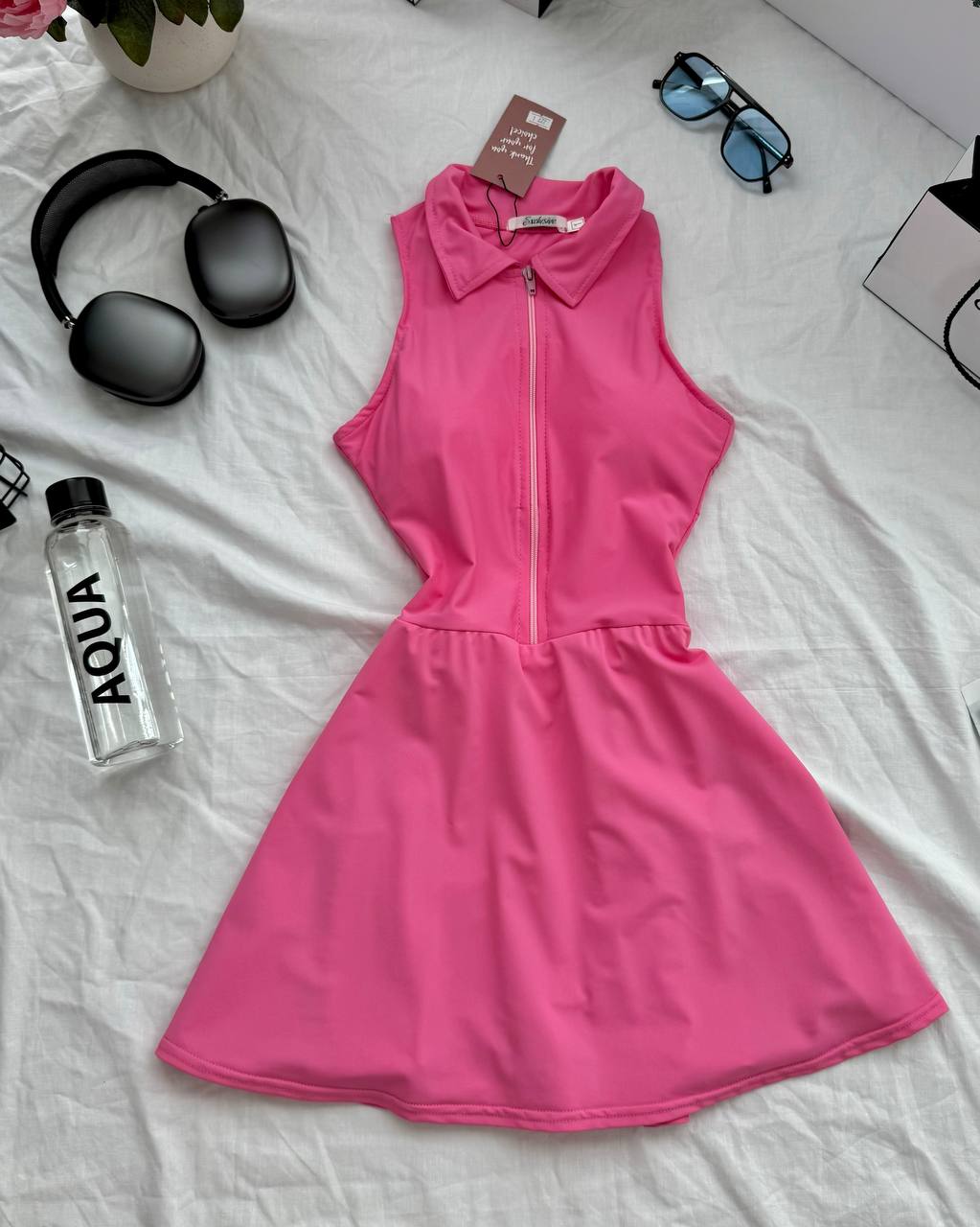 Удобное короткое платье – комбинезон на змейке, со съемными чашками. Идеально для спортивных занятий или прогулок. В шортиках есть кармашки по бокам для удобства. Ткань приятна к телу, хорошо тянется и садится по фигуре.
