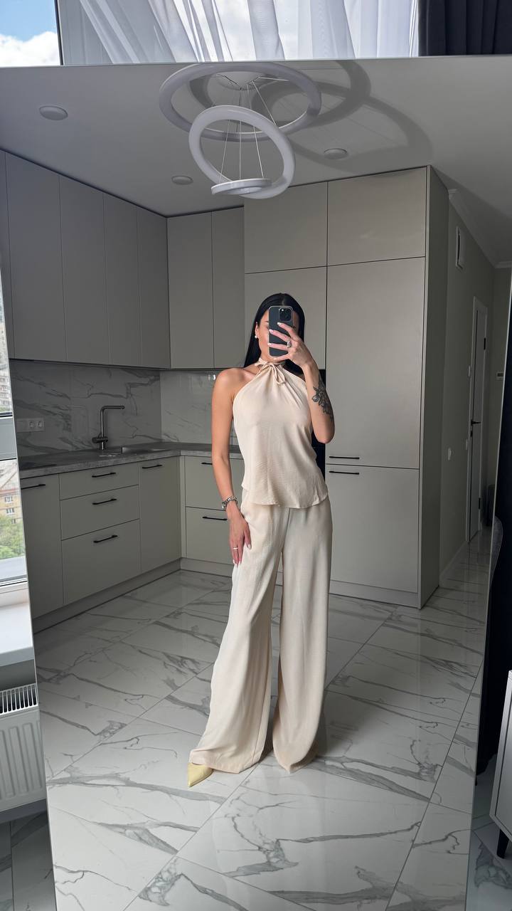 Удобный костюм летний: топ с открытой спиной+брюки на резинке беж