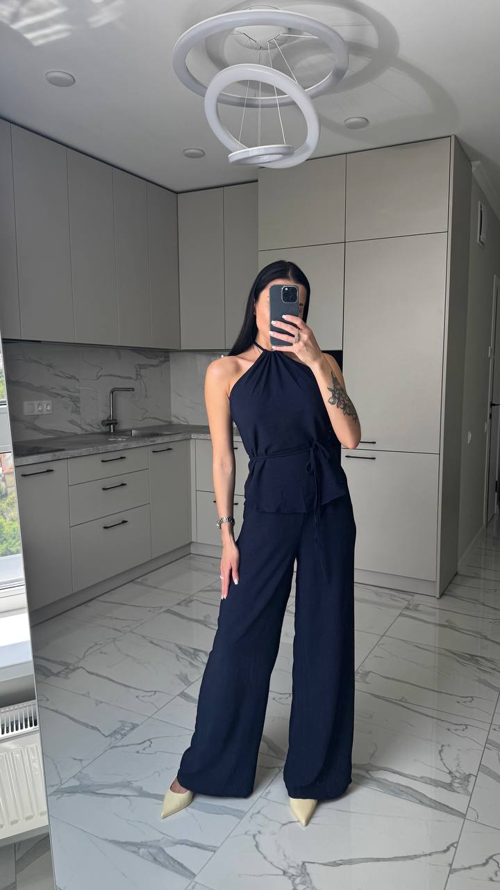 Удобный костюм летний: топ с открытой спиной+брюки на резинке темно-синий