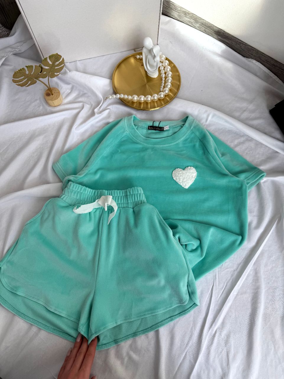 Удобный Костюм-пижама велюр спорт: футболка+шорты мята