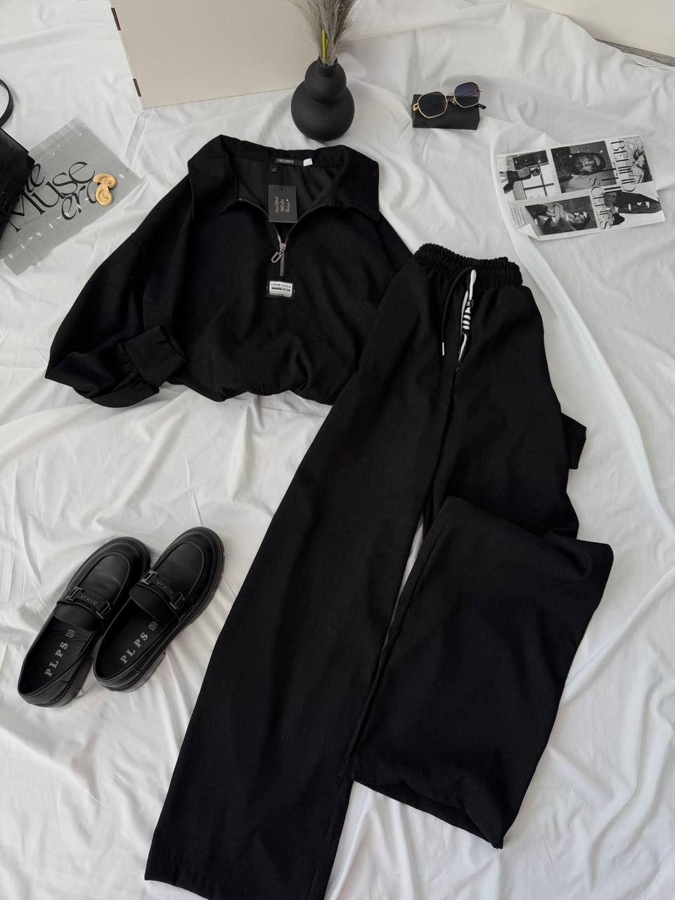 Удобный прогулочный костюм в базовых цветах сезона. Свободного фасона. Кофта на змейке, брюки со шнурком и карманами.