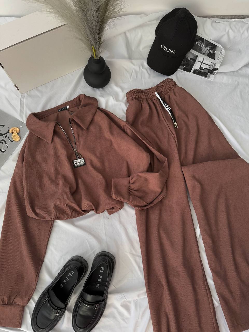 Удобный прогулочный костюм: Кофта на змейке+брюки со шнурком и карманами шоколад