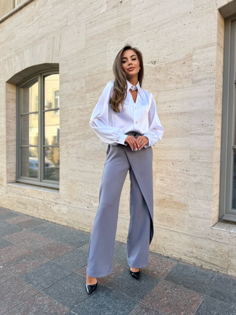 Прямые брюки с эффектным ассиметричным запахом спереди из костюмной ткани. Сочетаются с рубашками, футболками, свитшотами и тощами.