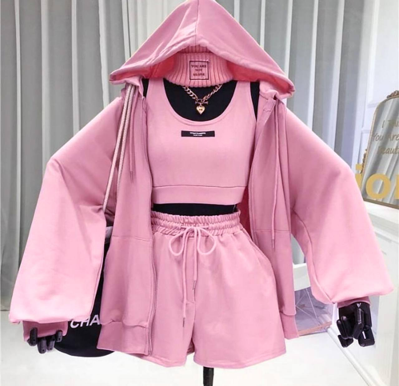 Универсальный спортивный костюм тройка с удлиненной худи, топа и шорт. Кофта на змейке, имеет карман и капюшон. Шорты на резинке. Топ с нашивкой. Приятная легкая ткань по сезону.