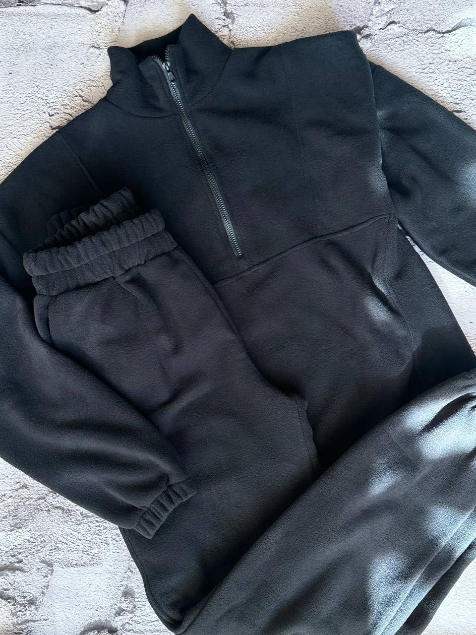 Уютный костюм флисовый: толстовка+штаны на манжетах черный