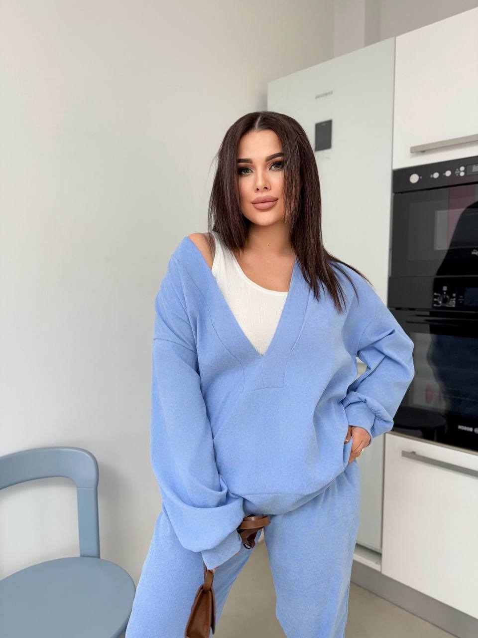 Вельветовый костюм (кофта с глубоким V-образным вырезом+брюки низ на резинке) голубой
