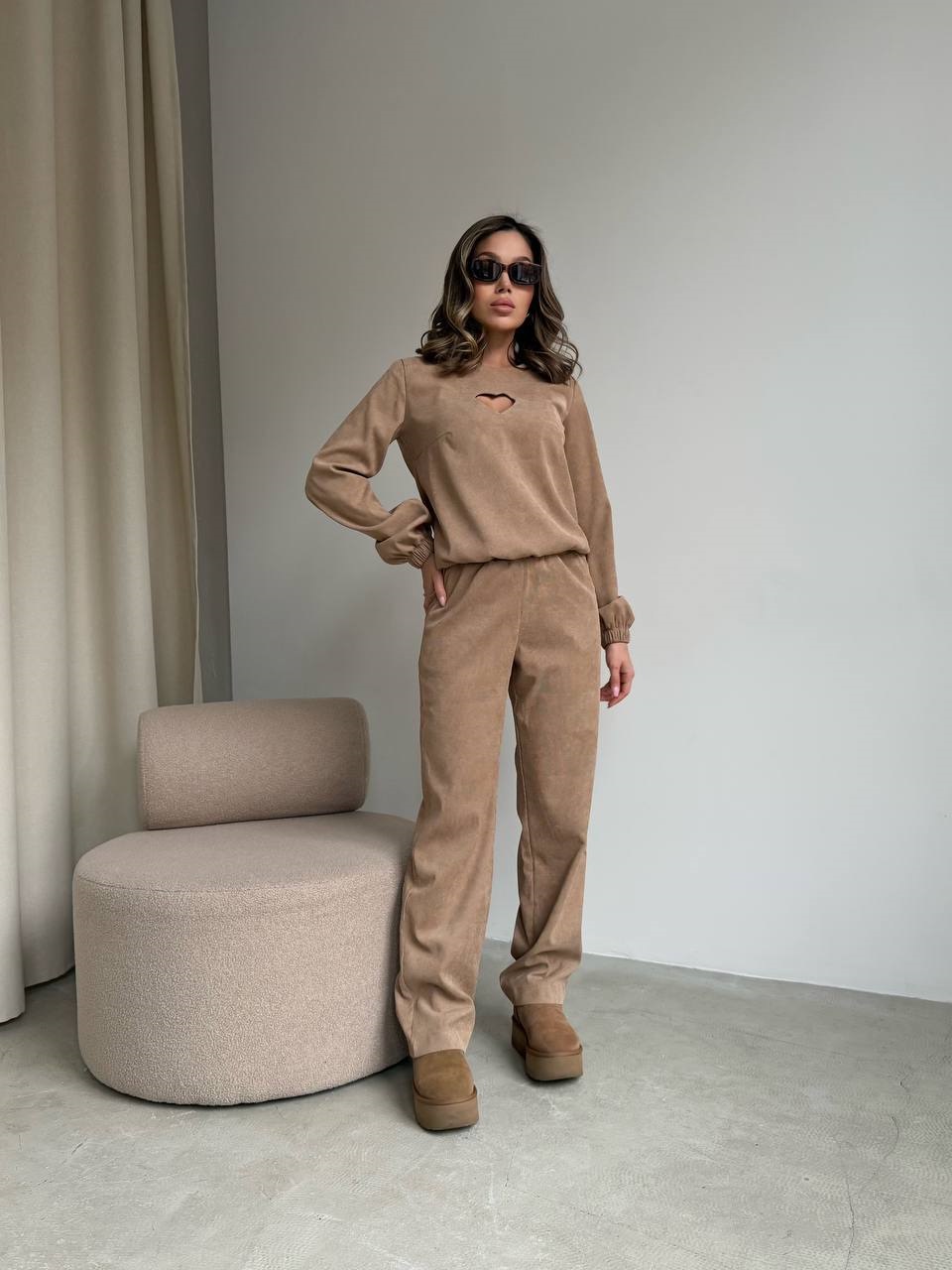 Представляем вельветовый костюм, состоящий из кофты с вырезом в форме сердечка и прямых брюк на эластичном поясе.