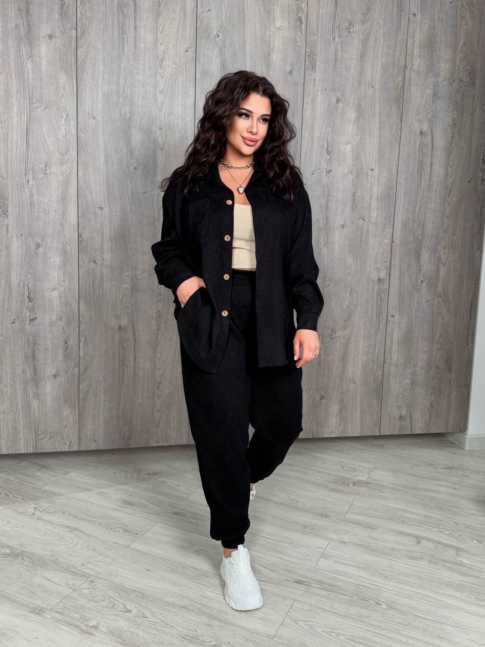 Вельветовый костюм (удлиненная рубашка с кармашком+брюки с манжетой на резинке) черный