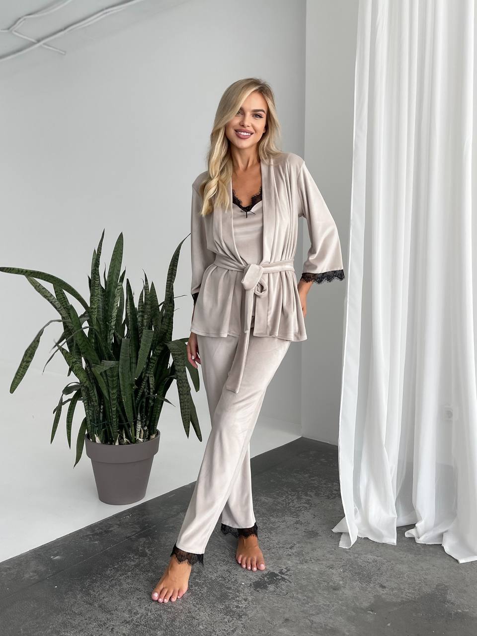 Велюровый комплект-тройка Пижама (майка+халат+штаны) бежевый