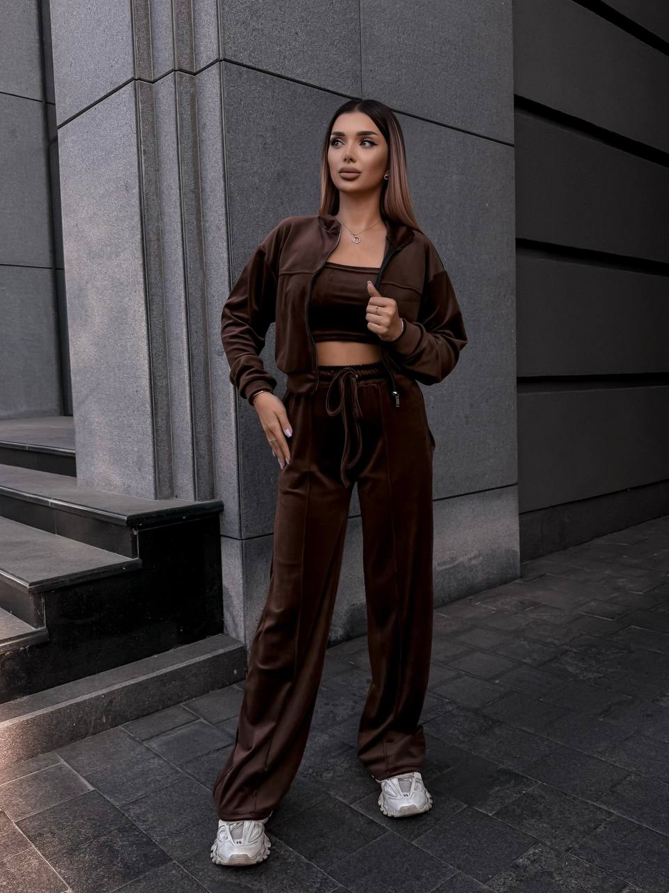 Велюровый костюм двойка: кофта со спущенным рукавом+брюки с высокой посадкой шоколад