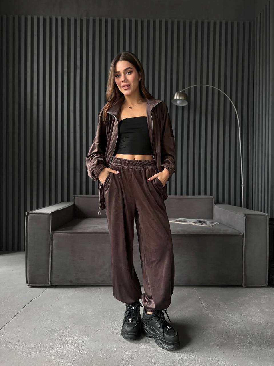 Велюровый костюм (кофта на молнии+брюки с манжетой на резинке) шоколад