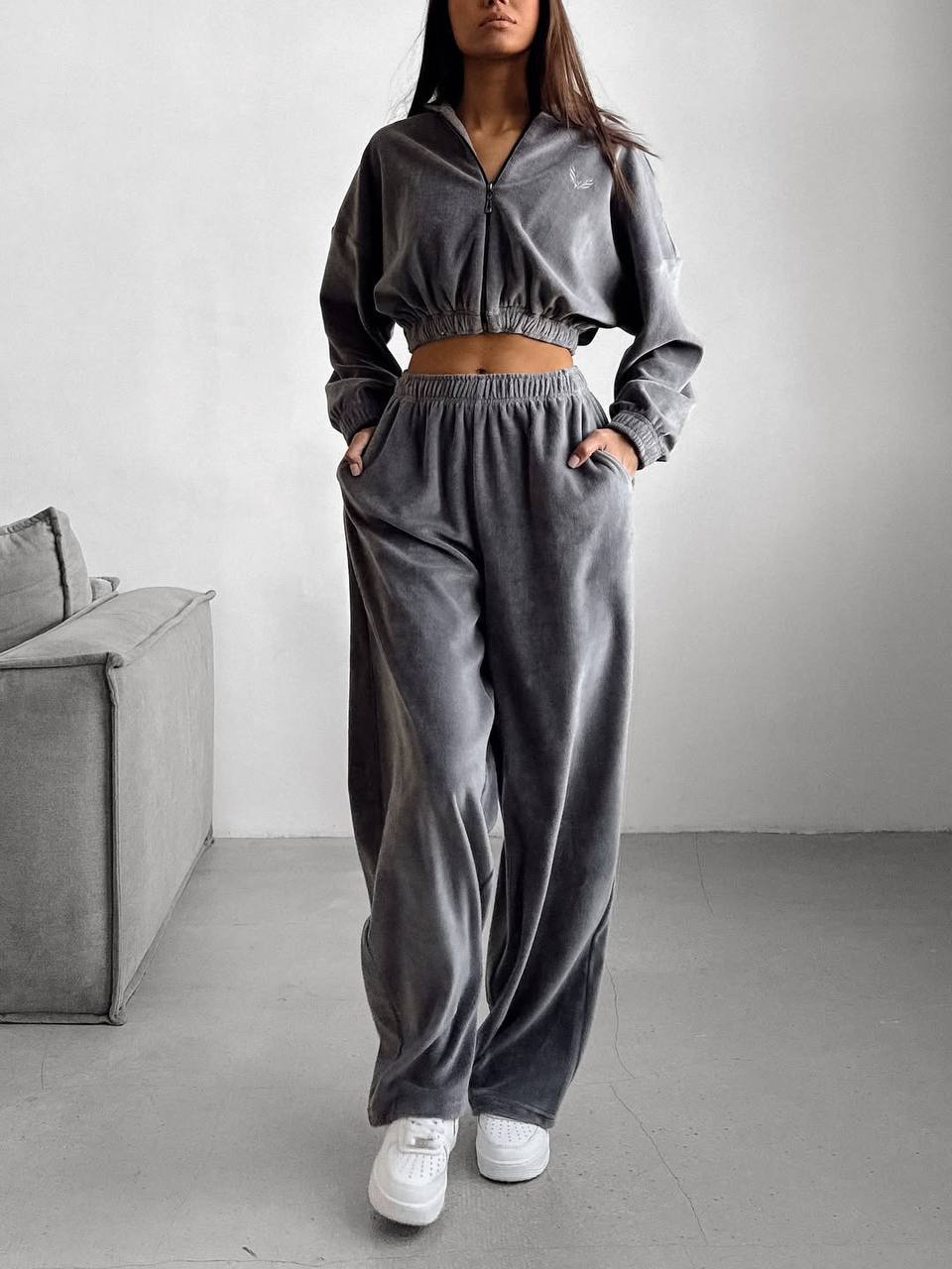 Велюровый костюм: короткая кофта+брюки-палаццо на затяжках графит