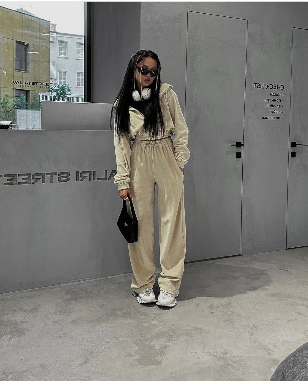 Велюровый костюм (укороченная кофта на молнии с капюшоном+свободные брюки) бежевий