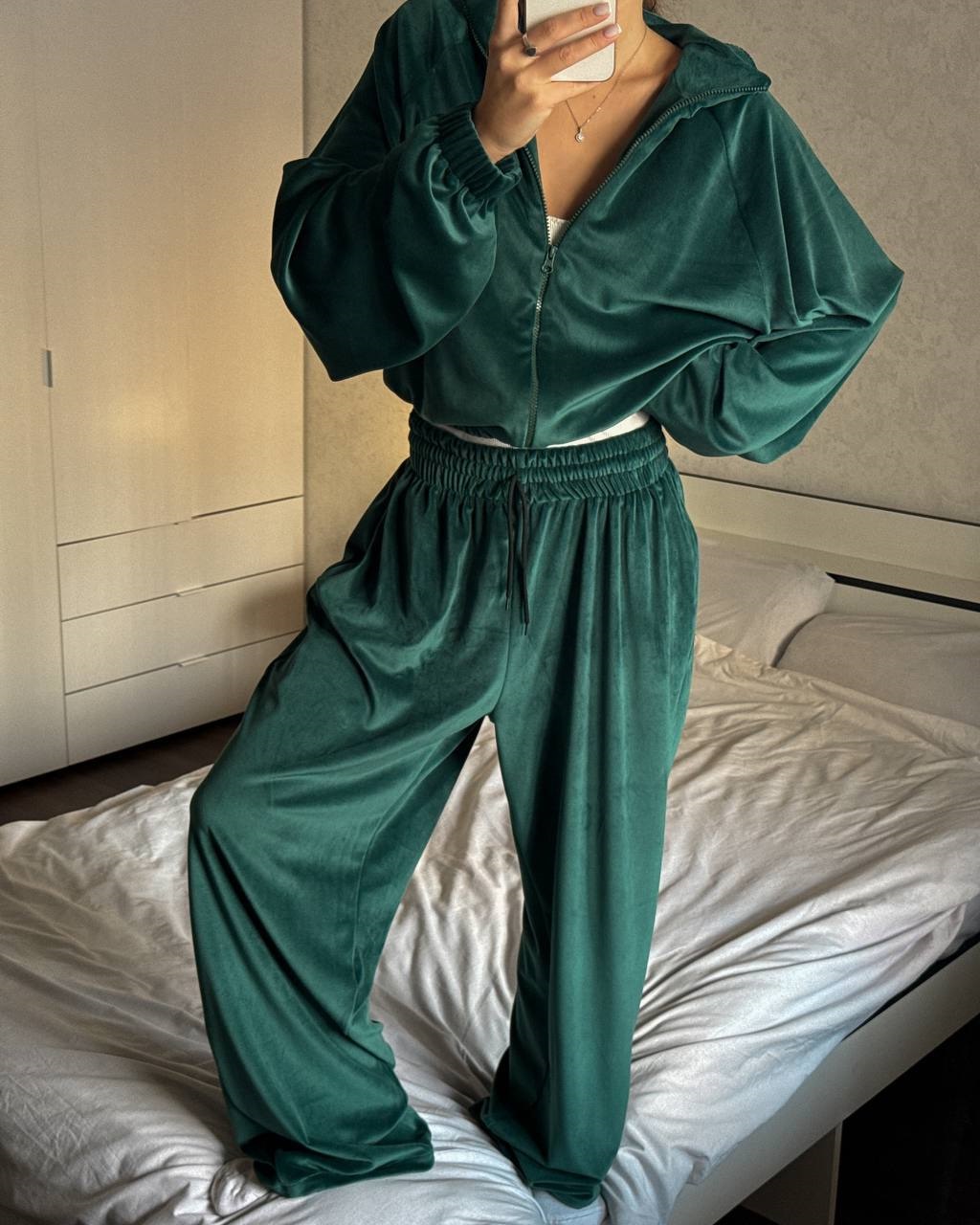 Велюровый оверсайз костюм (кофта с капюшоном+брюки с карманами) изумруд