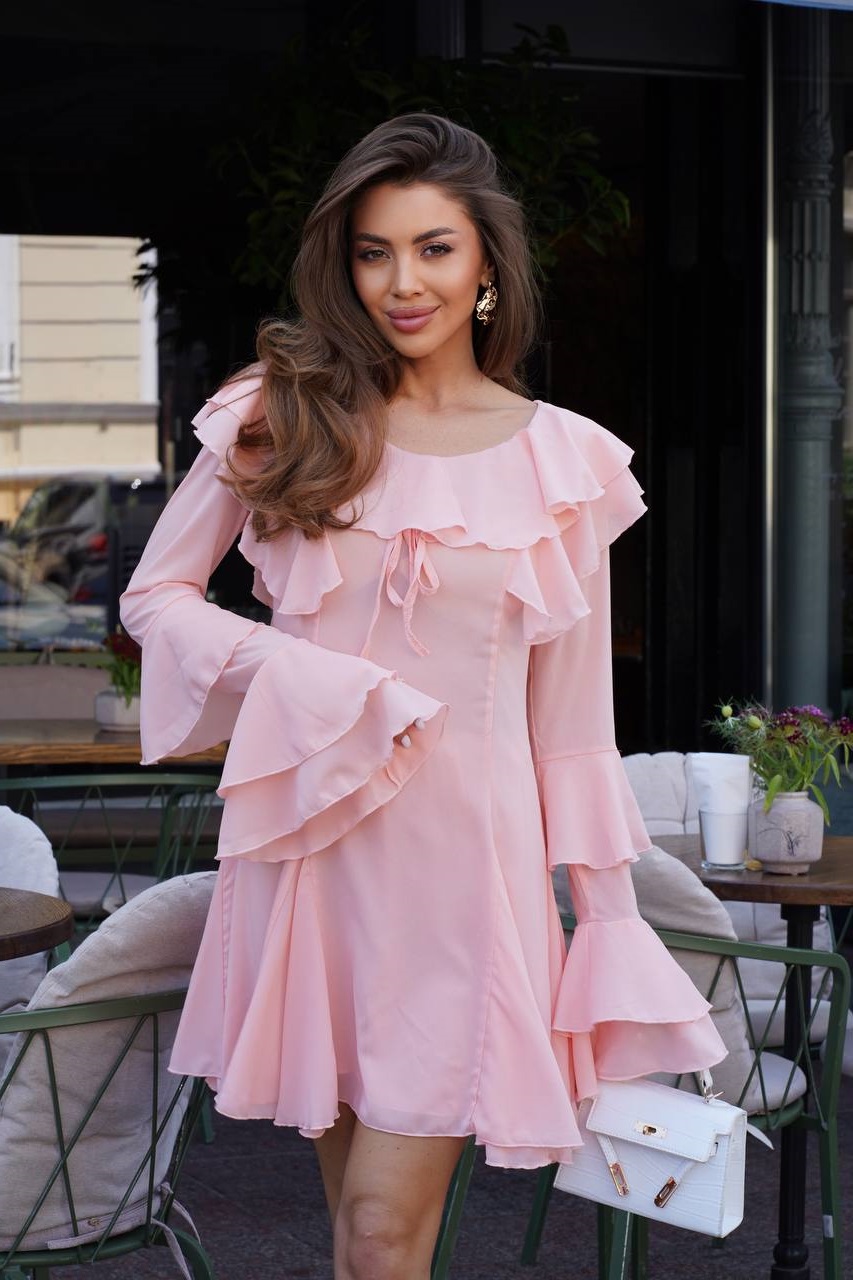 Воздушное платье из шифона с воланами приталенного силуэта пудра