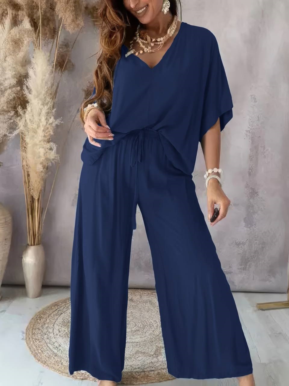 Будьте первым, кто оставил отзыв на “Яркий костюм свободного кроя (брюки+кофточка со спущенным плечом) темно-синий”