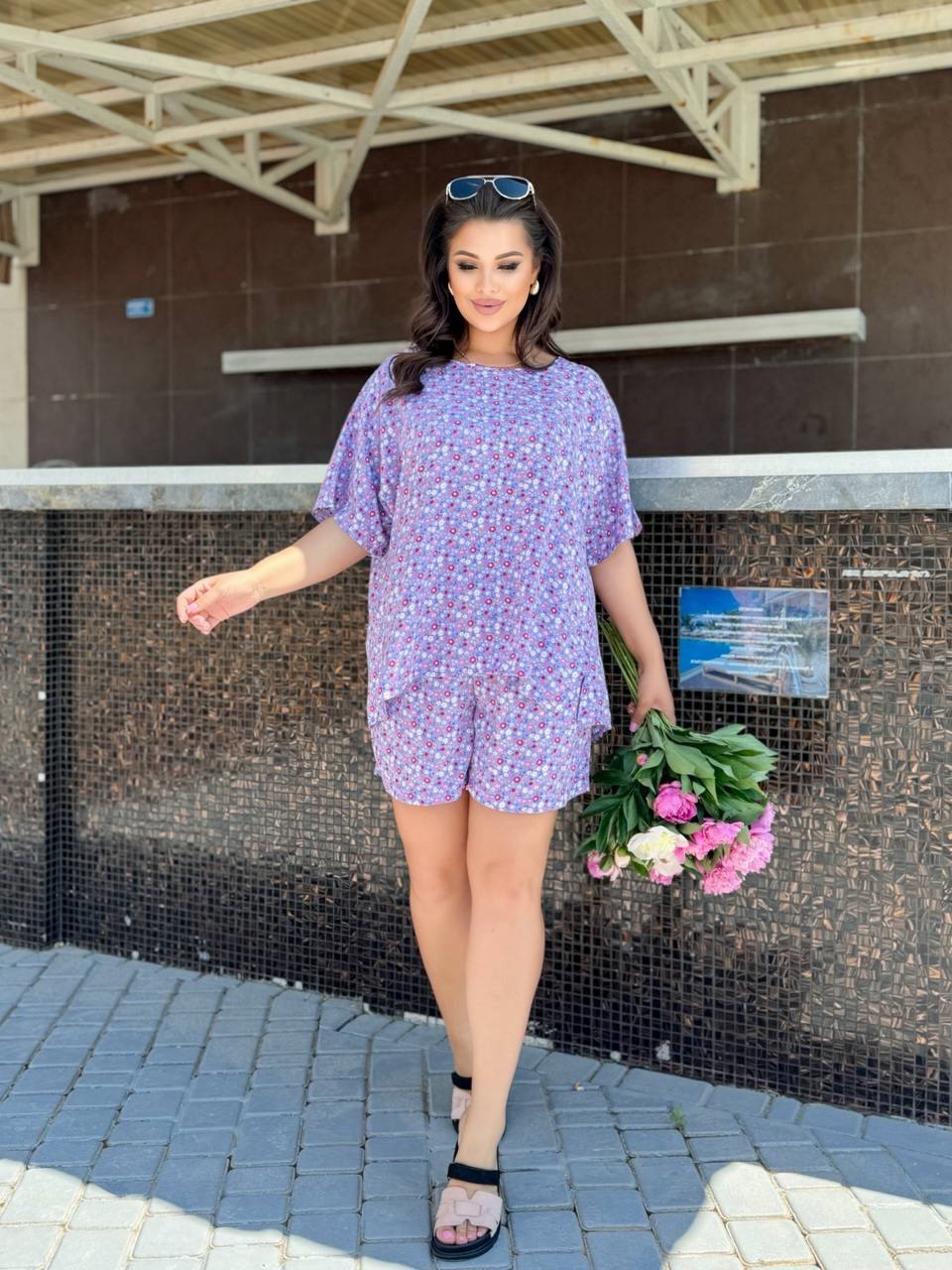 Яркий женский костюм (шорты+туника) штапель лаванда+черный
