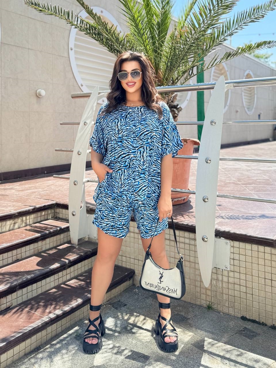 Яркий женский костюм (шорты+туника) штапель синий+черный