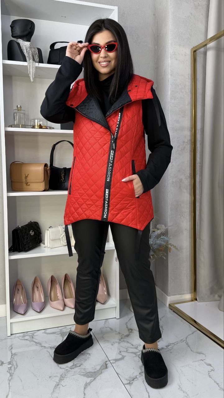 Женская стеганая жилетка с оригинальной молнией красный